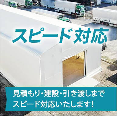お見積もり・事務対応はもちろん、建設もスピーディーに対応しております。テント倉庫は骨組みにシートを張るだけのシンプルな構造のため、短納期で導入することができます。 大きさや機能性によっても工期が異なりますが、1ヶ月〜3ヶ月程度で建設することができるので、急遽倉庫が必要となった場合もご相談ください。