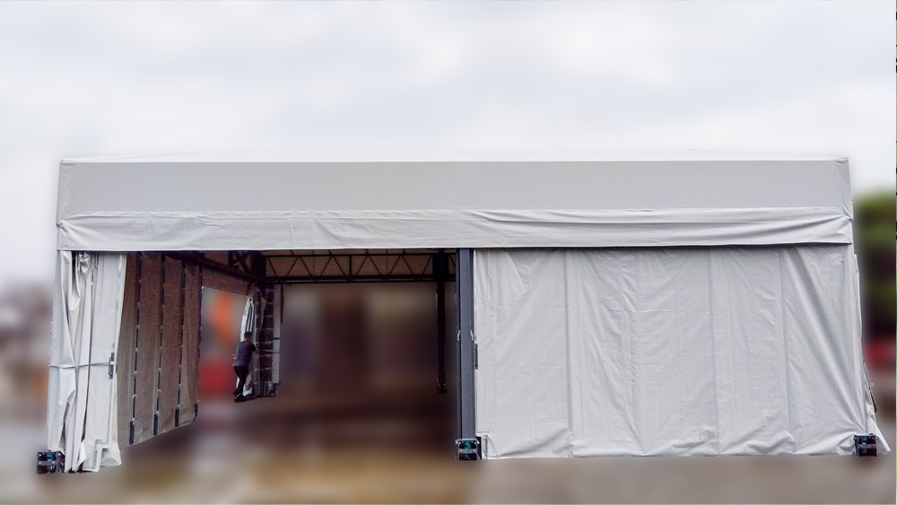 倉庫の出入口部分に雨を避けるためにテント倉庫(上屋テント)を設置。両サイドは開閉できるようにするため、スライドカーテンを設置致しました。