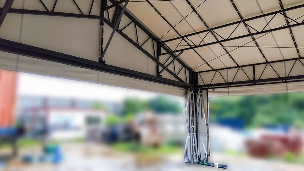 本案件では、上屋テントに芯材カーテンを取り付け、最大限の開口確保と4面開口仕様を実現しました。 天候や作業内容に合わせて自由に開放・閉鎖ができるため、現場の利便性と作業効率が向上します。 当社では、お客様の要望に応じた最適な開口計画をご提案しています。
